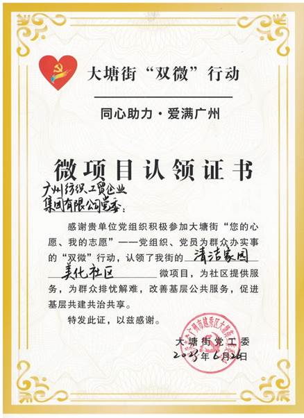 黨建引領(lǐng)聚合力 志愿服務(wù)暖民心——紡織公司黨委積極參與大塘街“雙微”行動(dòng)獲頒微項(xiàng)目認(rèn)領(lǐng)證書